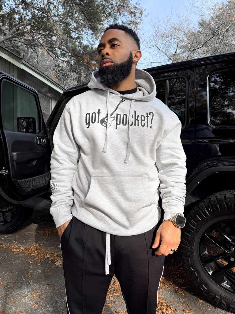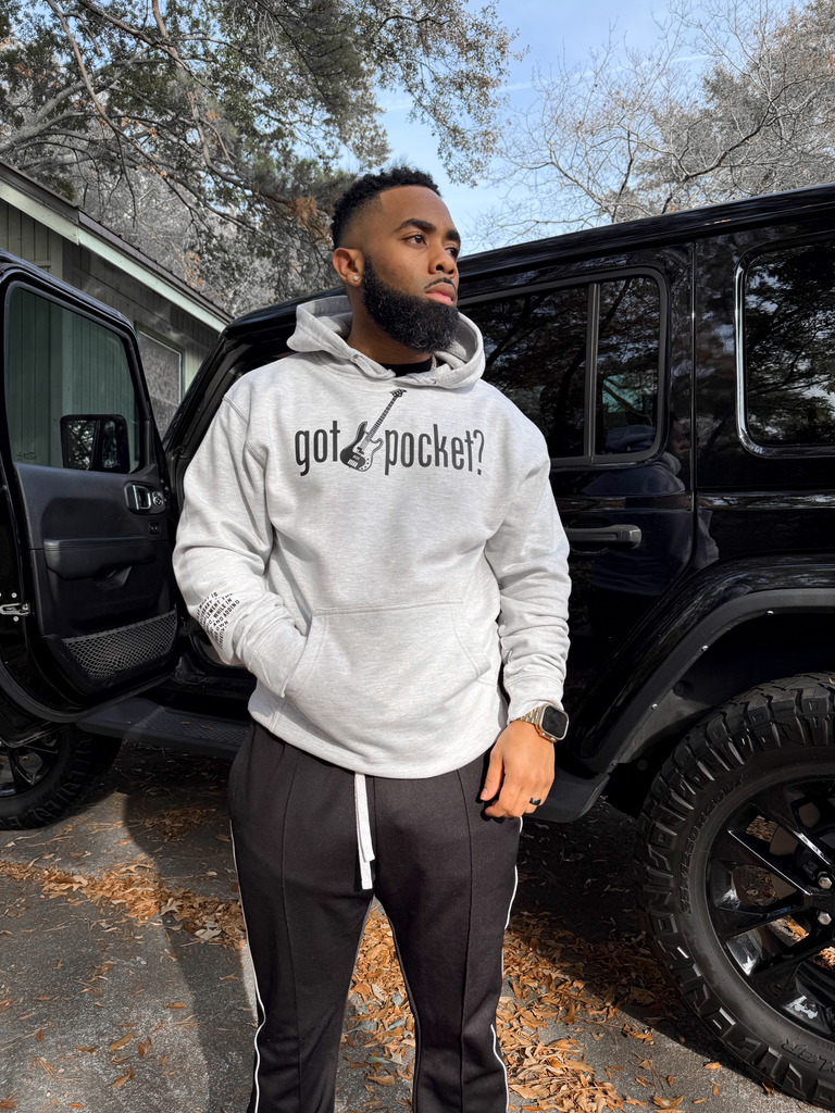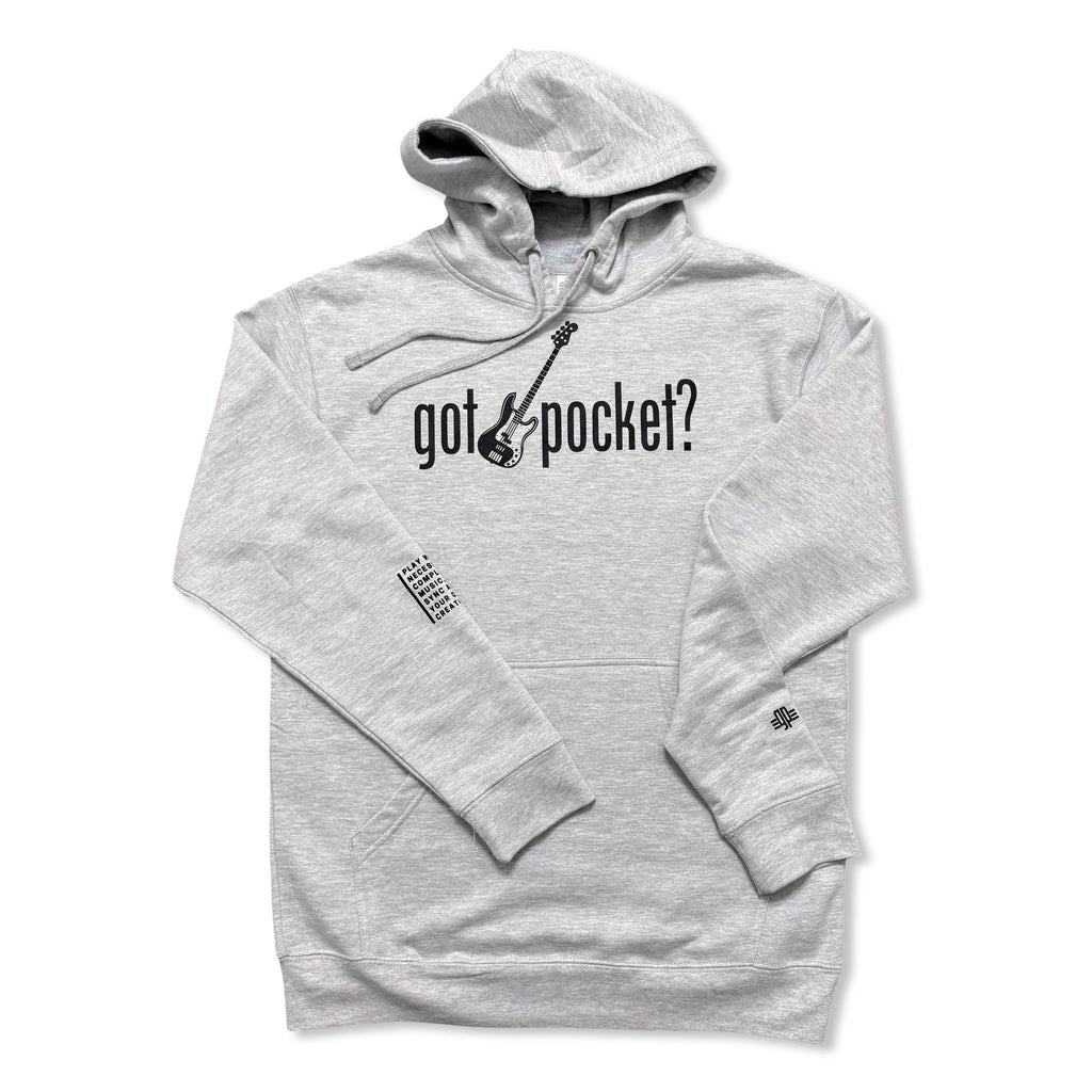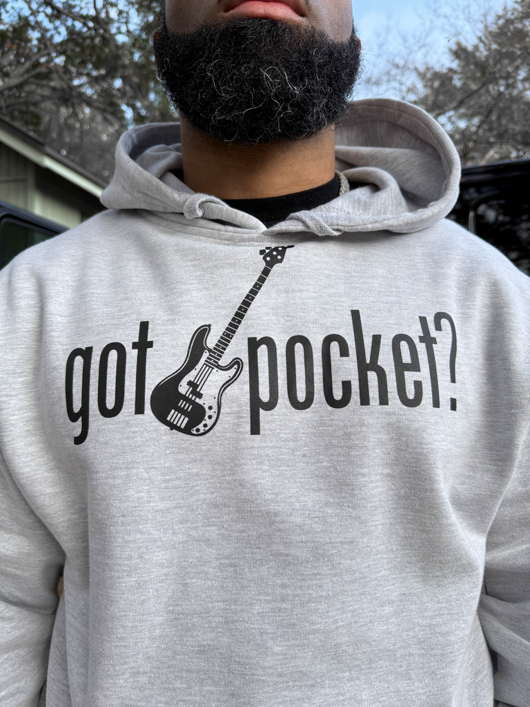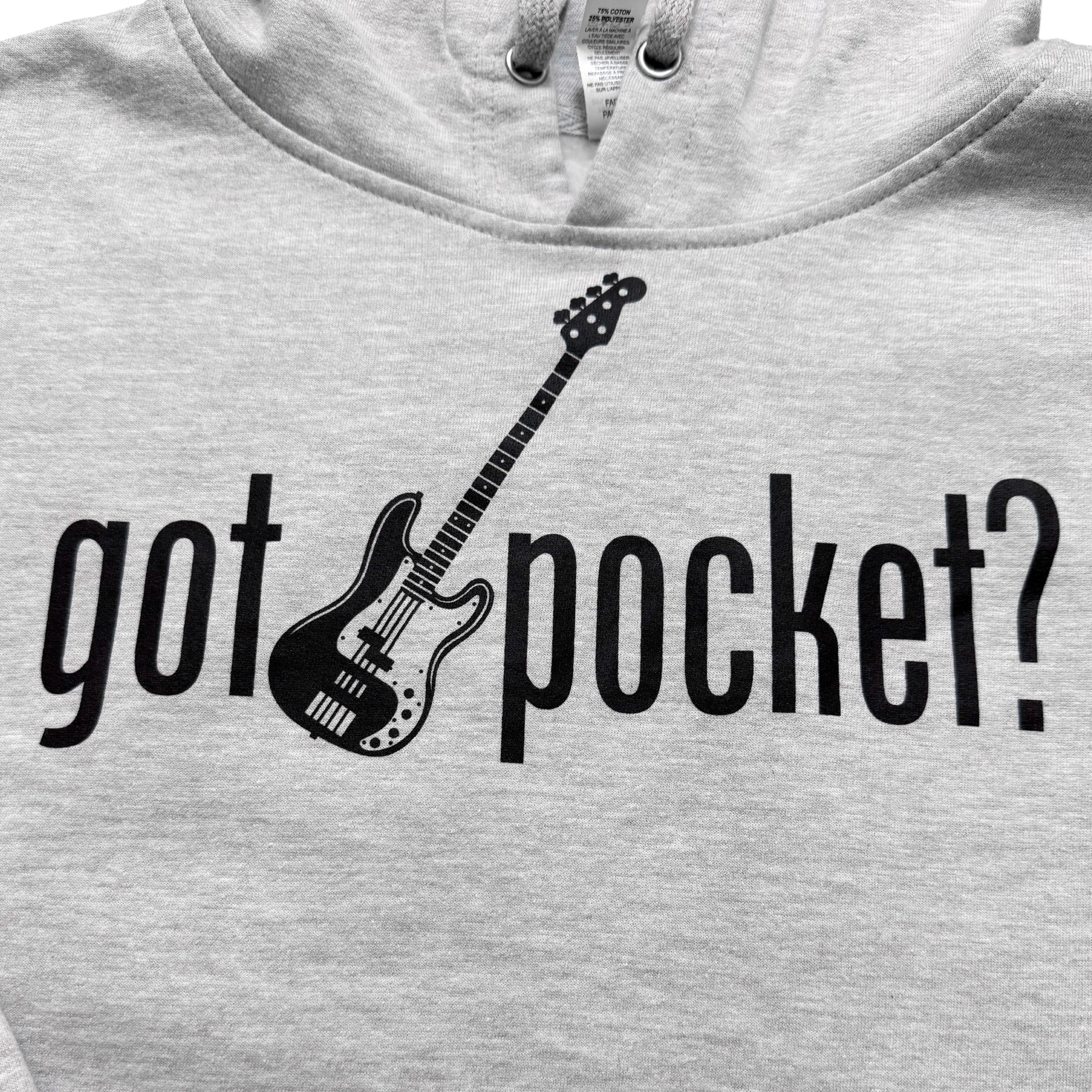 Grey hoodie. Black printed “got pocket?” text across chest. Black printed bass guitar in the middle. Black printed "gp" on left wrist. Black definition of pocket printed on the right forearm.