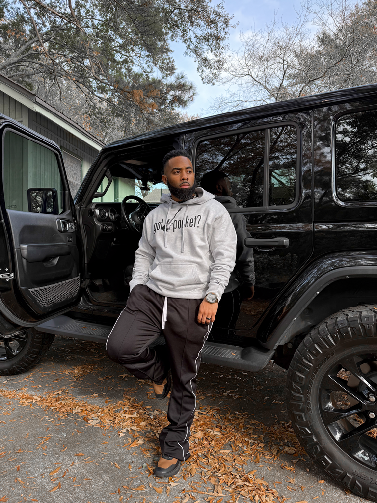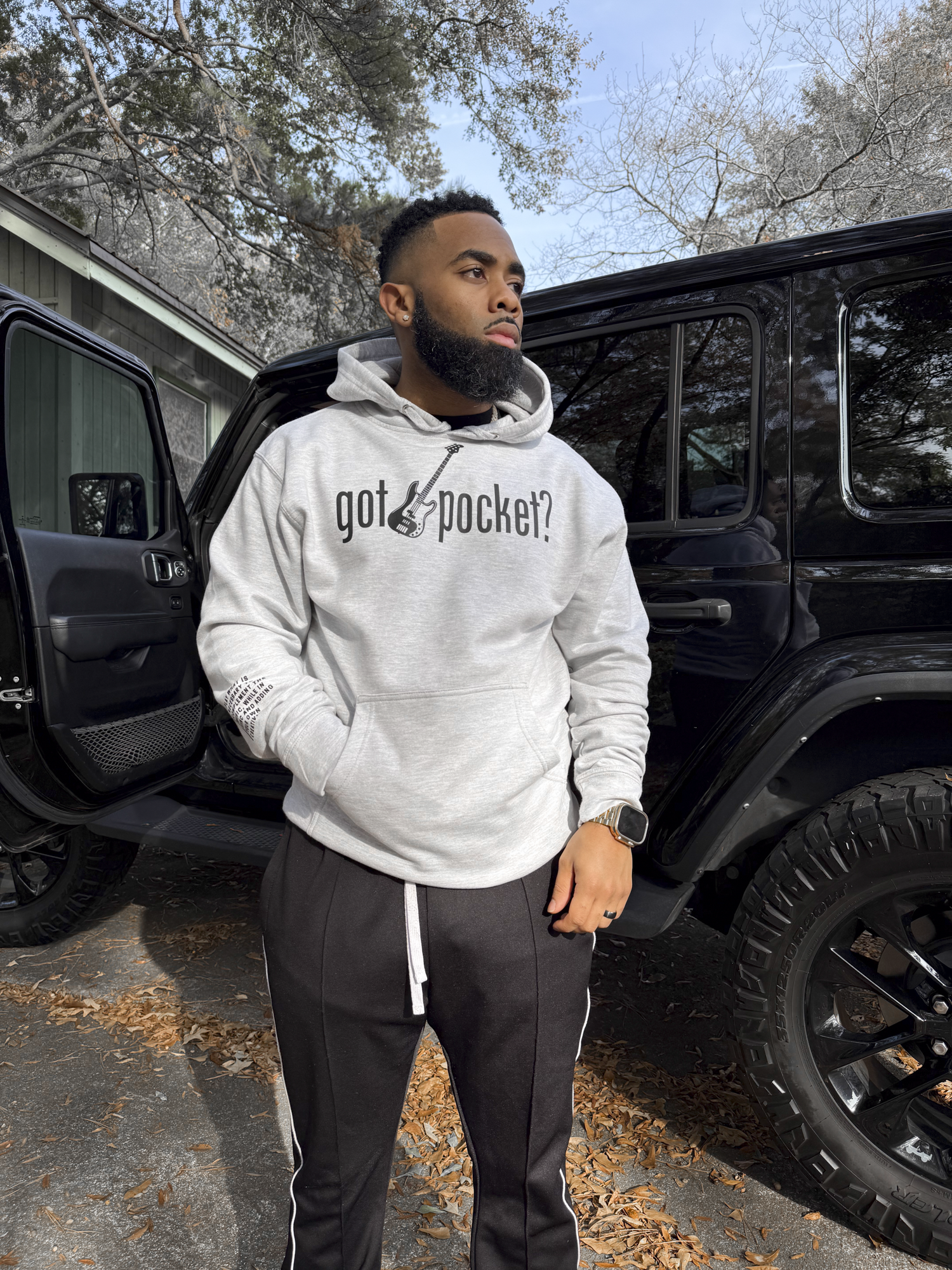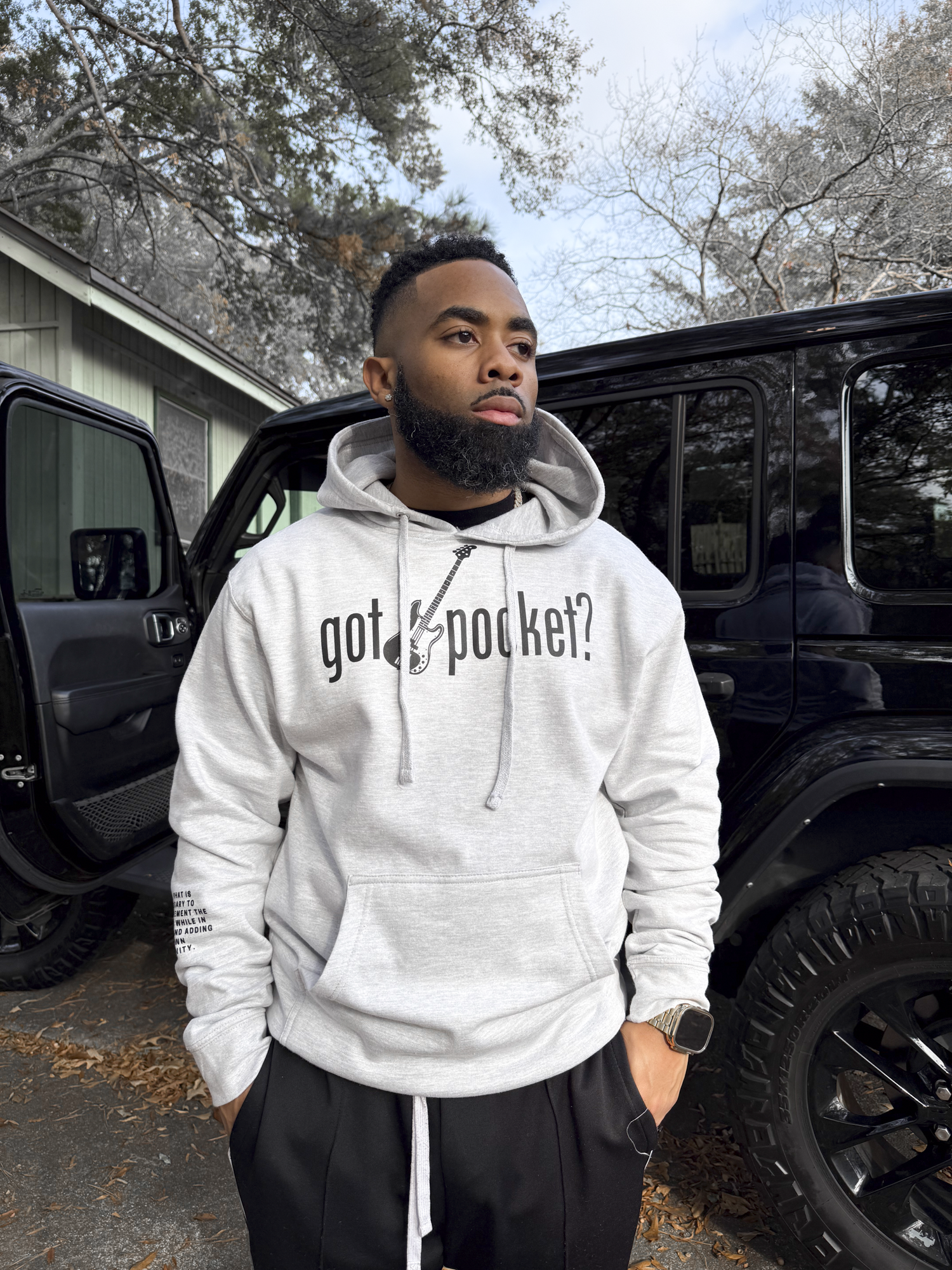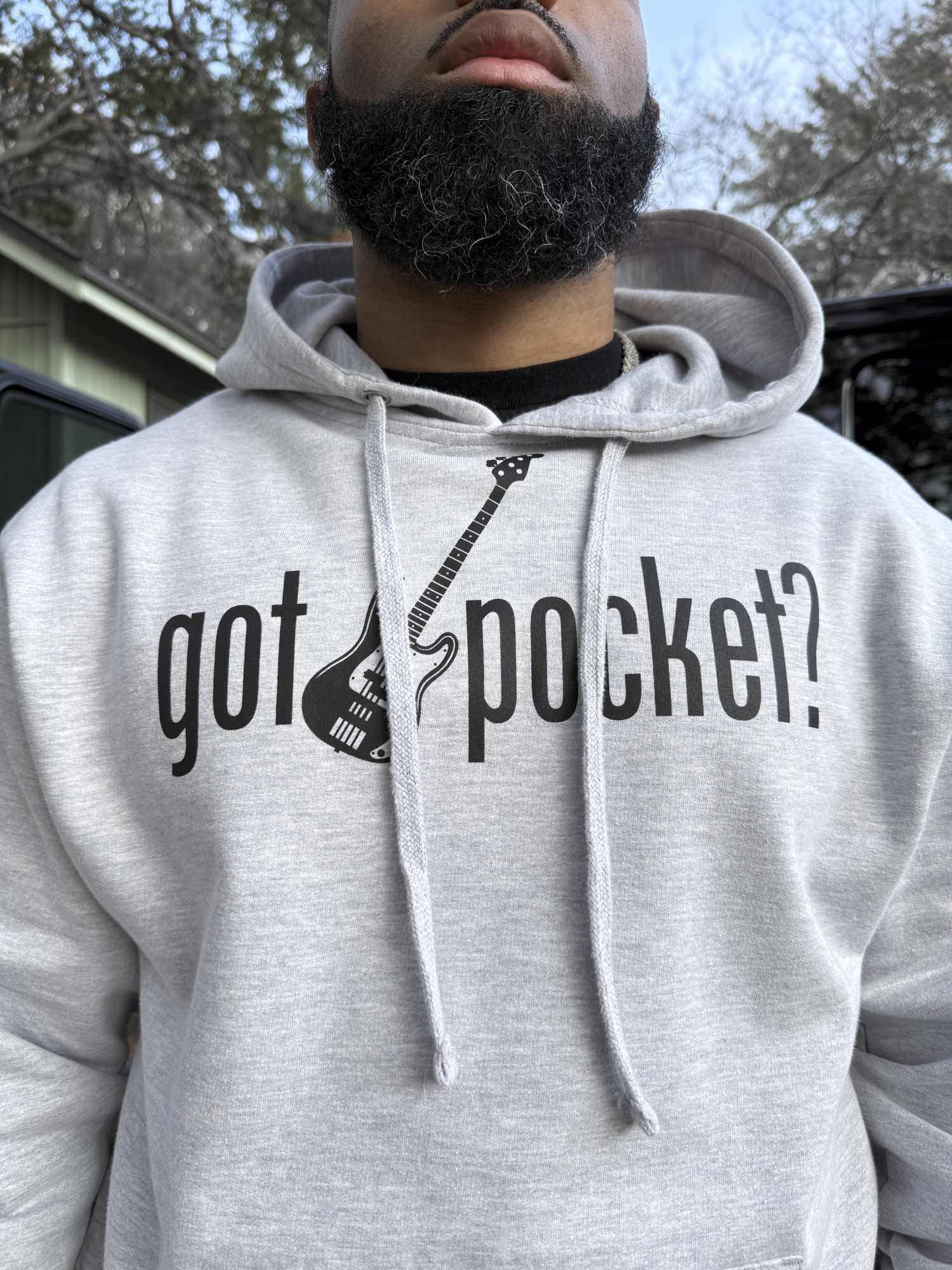 Grey hoodie. Black printed “got pocket?” text across chest. Black printed bass guitar in the middle. Black printed "gp" on left wrist. Black definition of pocket printed on the right forearm.