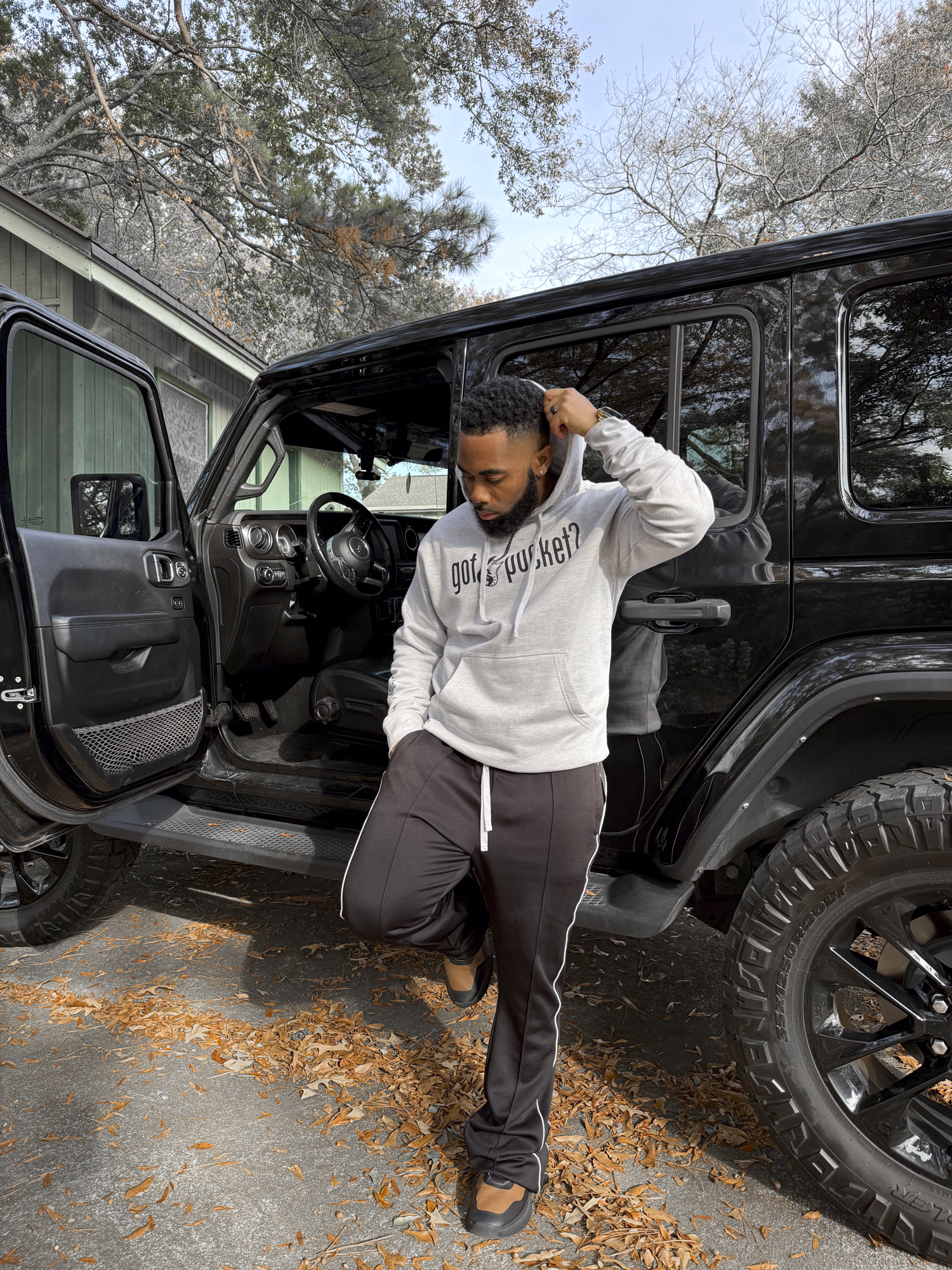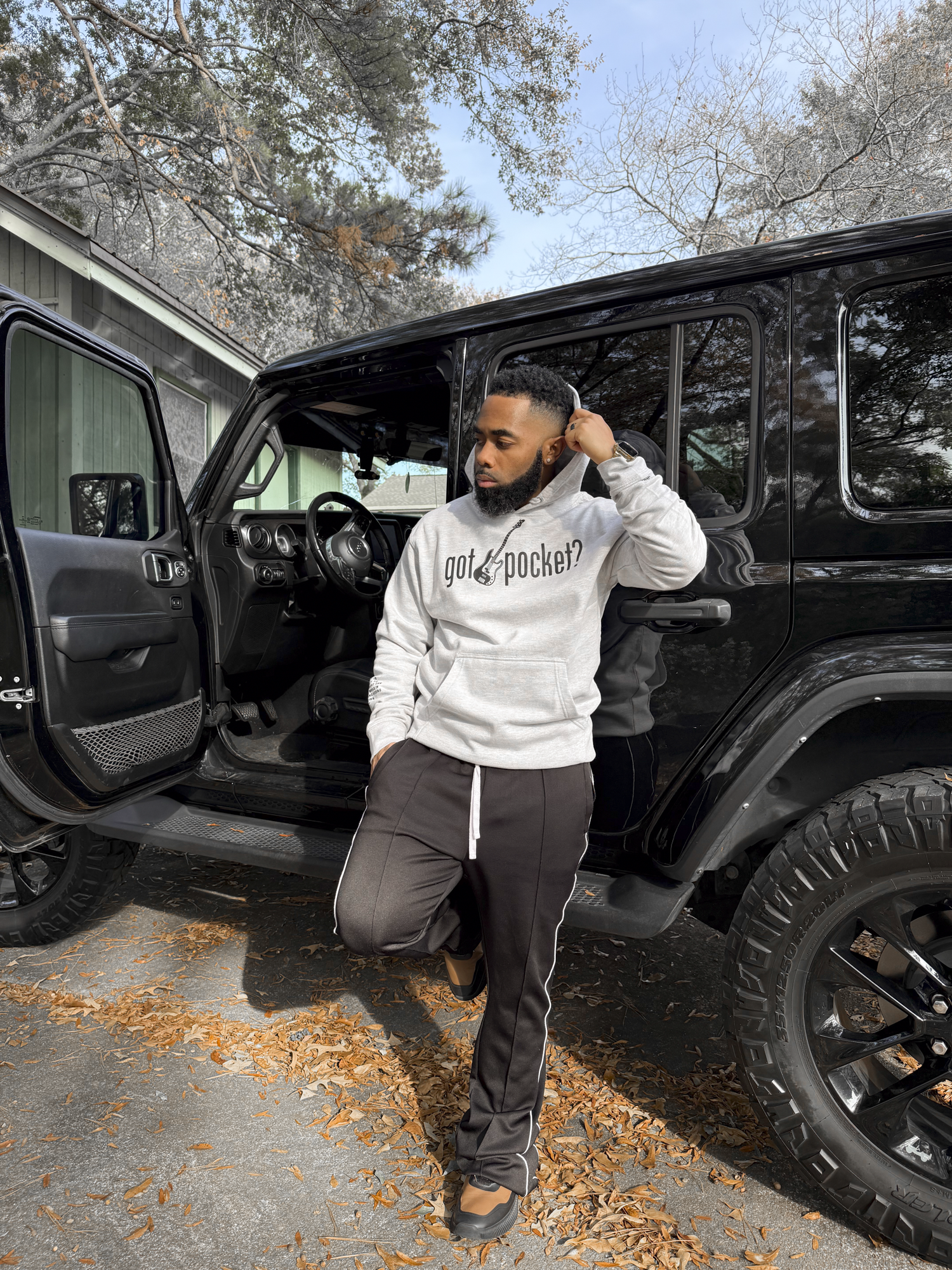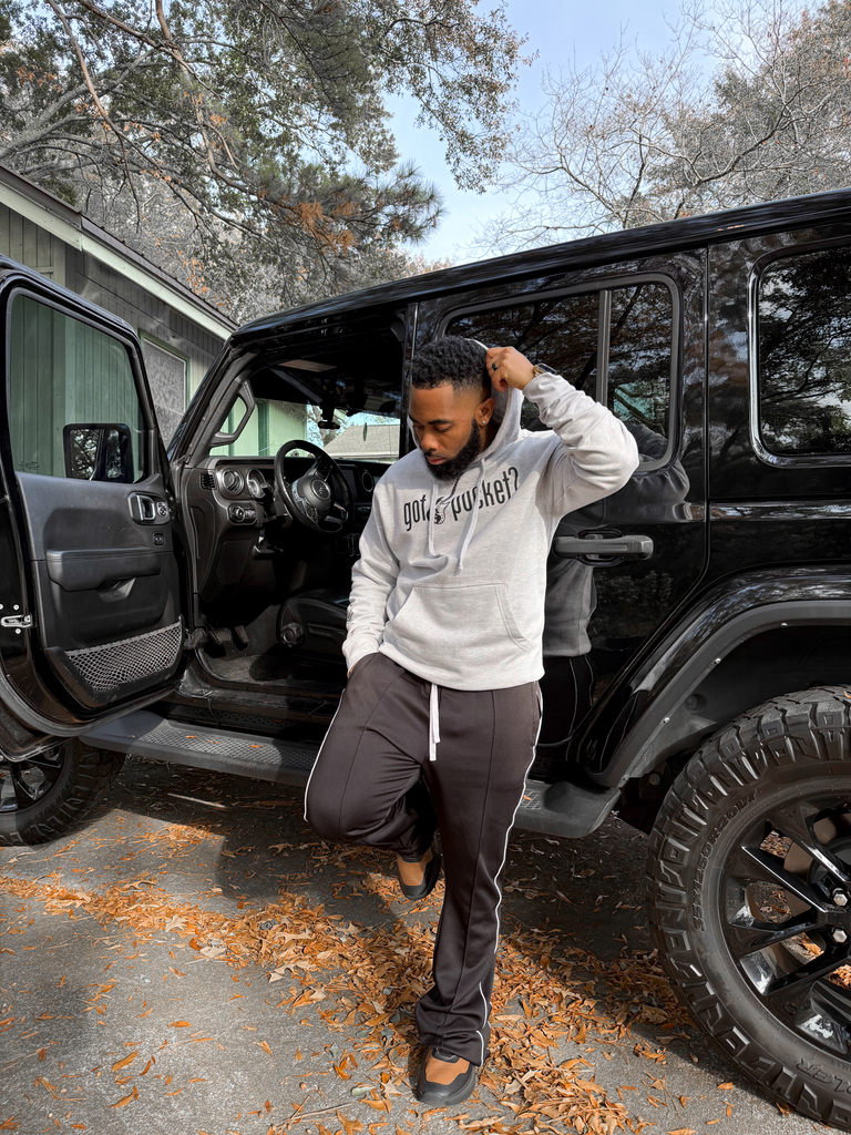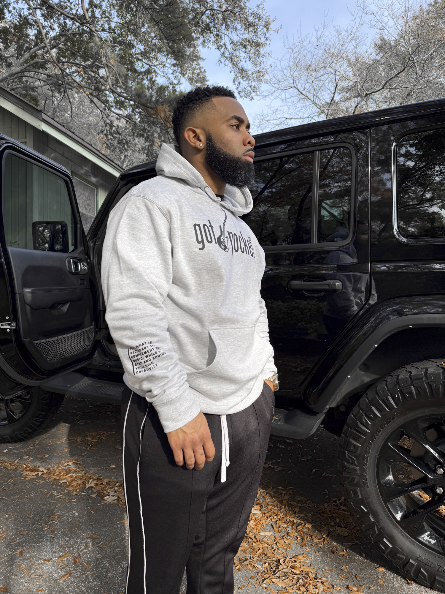 Grey hoodie. Black printed “got pocket?” text across chest. Black printed bass guitar in the middle. Black printed "gp" on left wrist. Black definition of pocket printed on the right forearm.